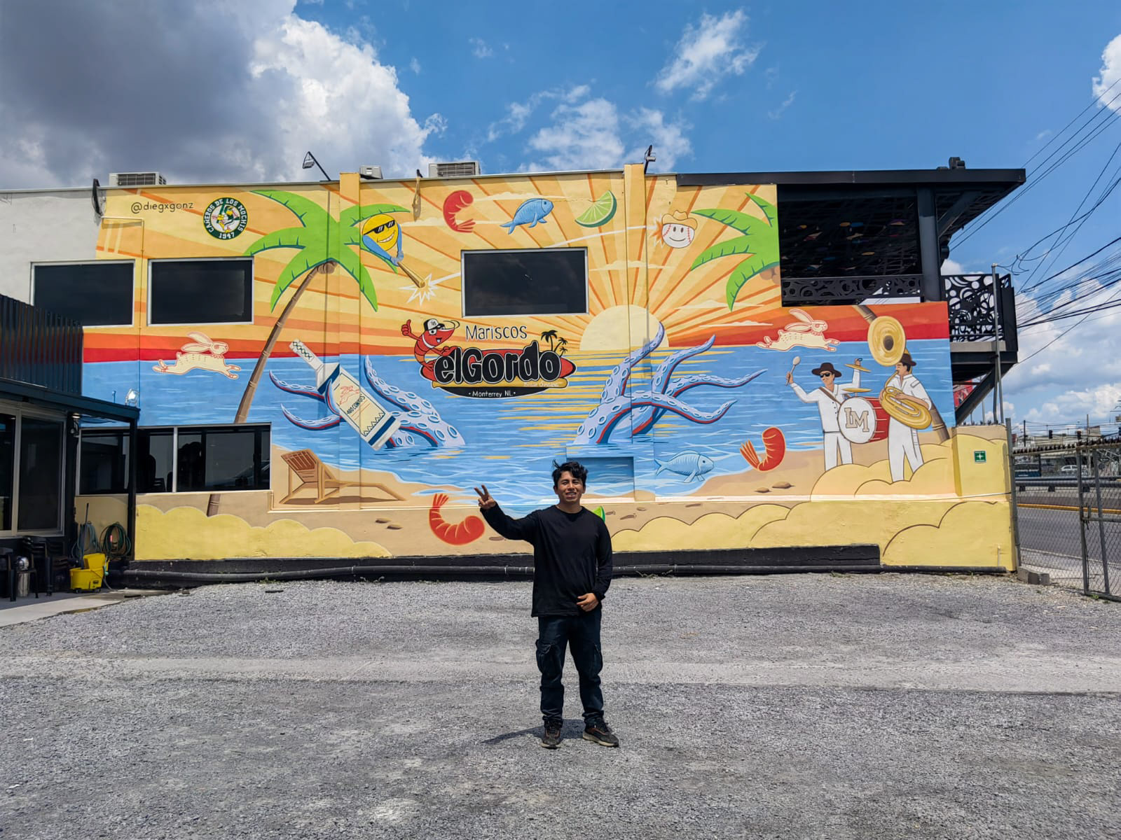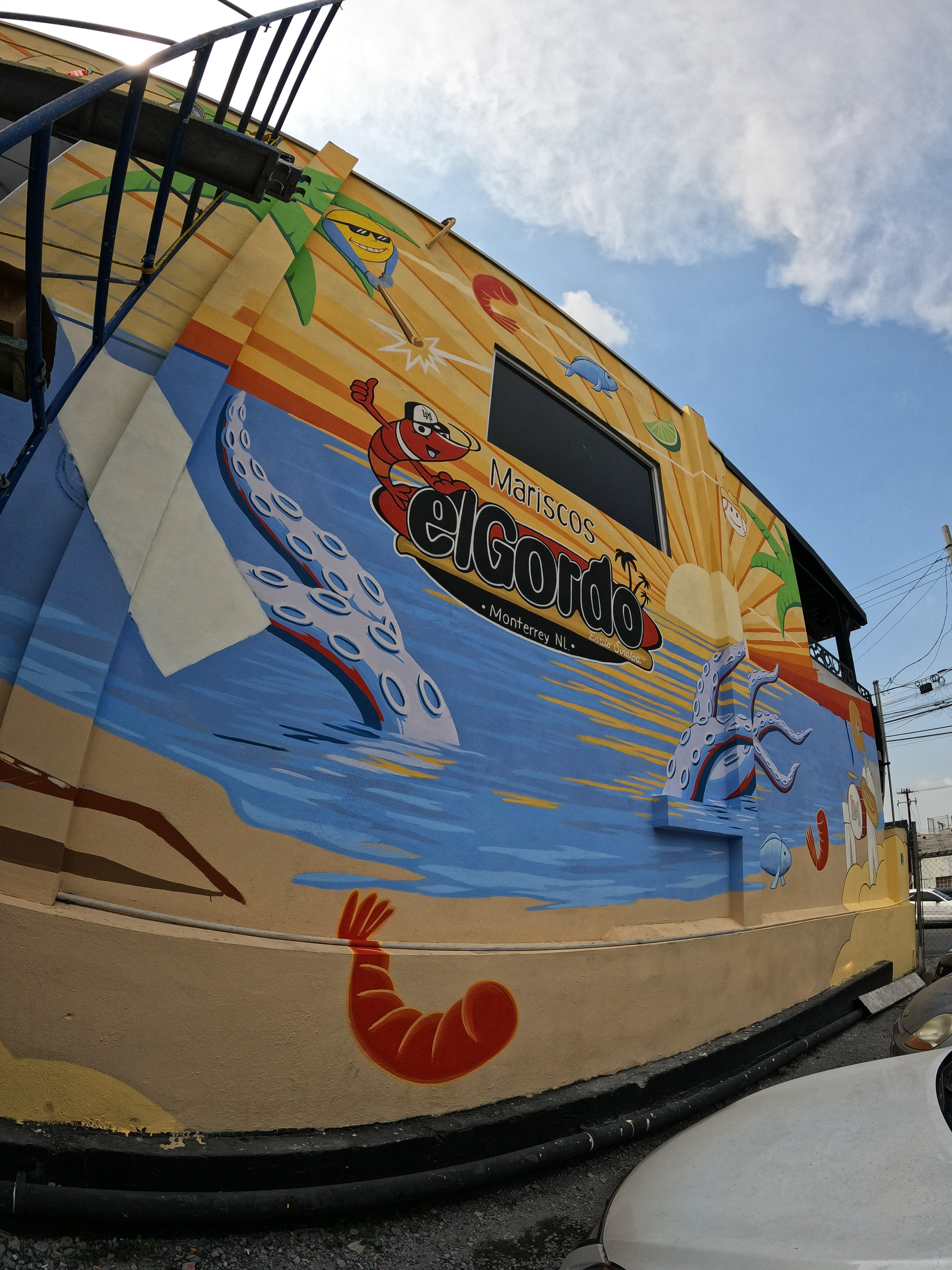 Mural ubicado en el estacionamiento de Mariscos el Gordo Sucursal Cumbres, realizado en Abril del 2025.